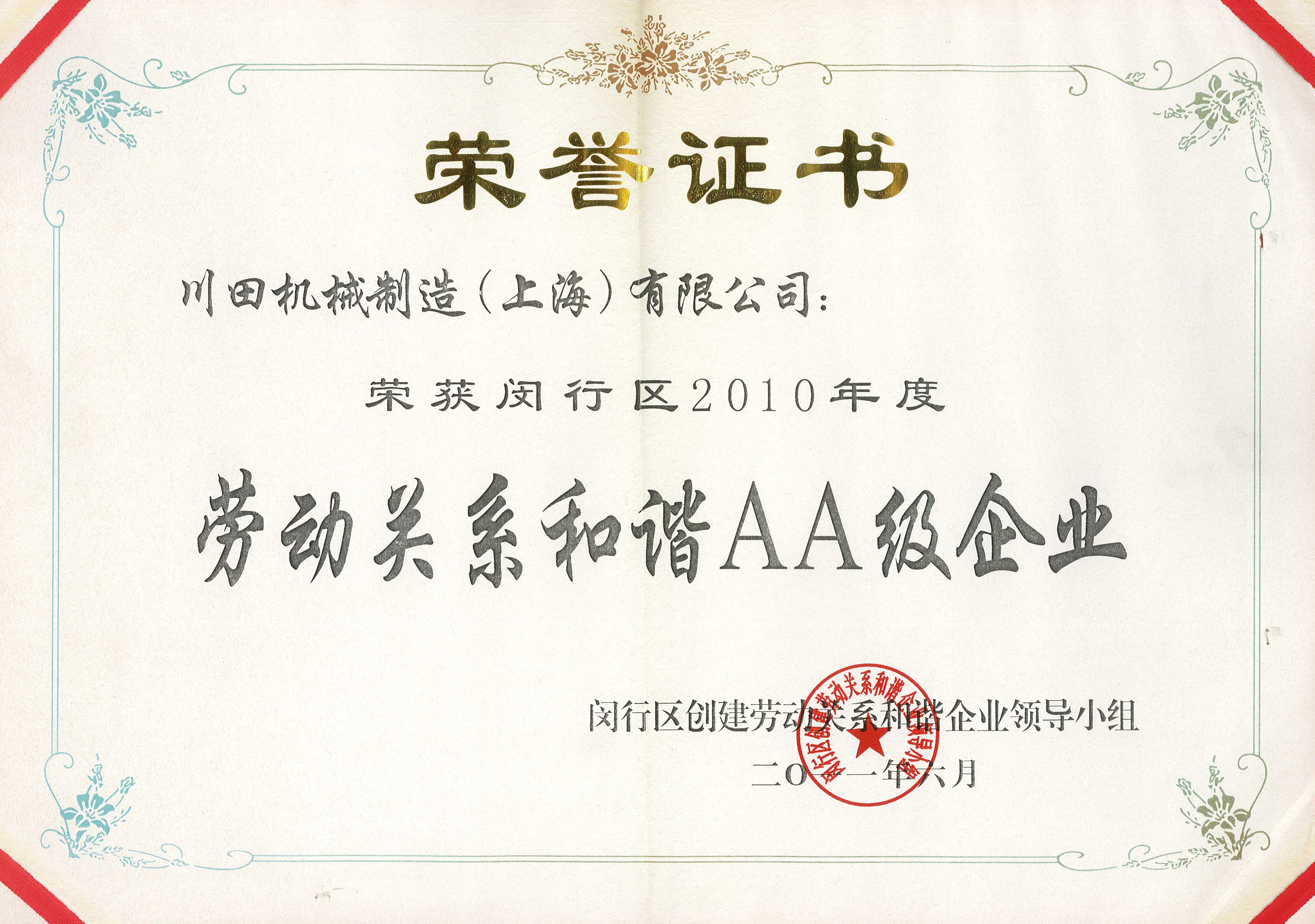 2010 閔行區(qū)勞動(dòng)關(guān)系和諧AA級(jí)企業(yè)